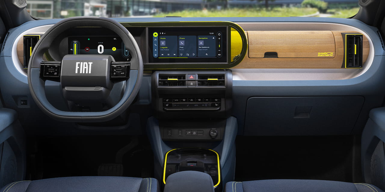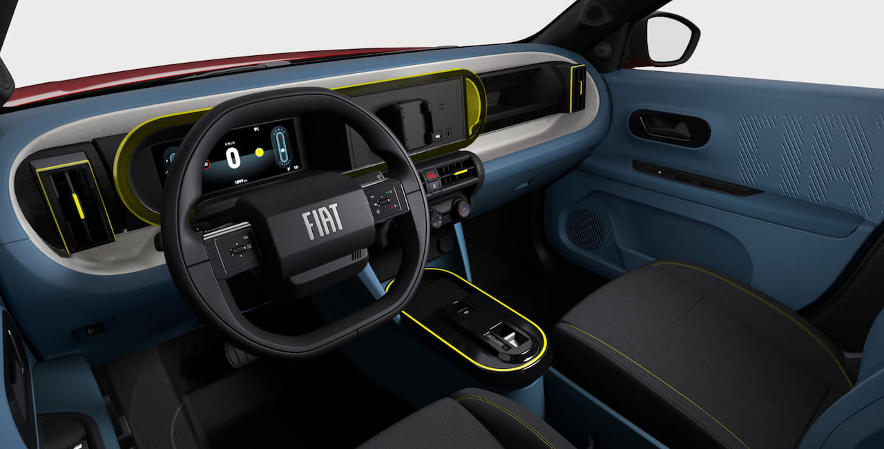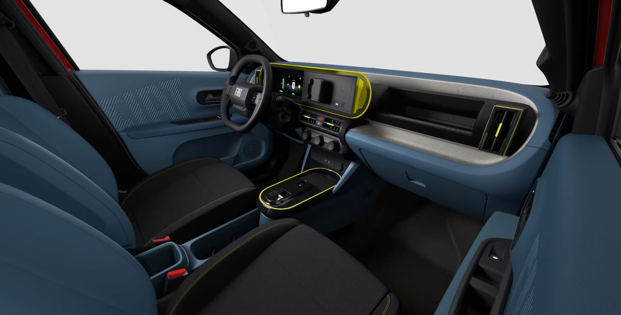 Joyeux et coloré, l'intérieur de Grande Panda dispose d'éléments en plastique conçus à partir de matériaux recyclés. En outre, elle dispose d'une planche de bord avec revêtement en véritable fibre de bambou, d'un écran tactile de 10,25" et d'un chargeur smartphone à induction. Elle propose également une climatisation automatique, un accoudoir central et des sièges arrière rabattables 60/40 pour une plus grande polyvalence.