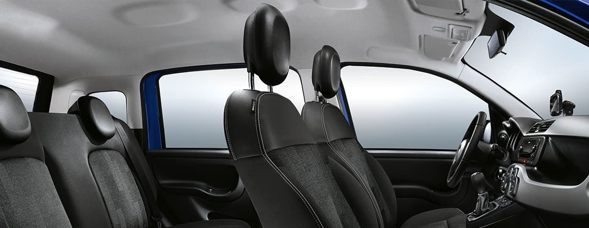 À l'intérieur de votre Fiat Panda Hybrid, vous allez découvrir comment la nouvelle sellerie en tissu noir se marie bien avec le monogramme Fiat.